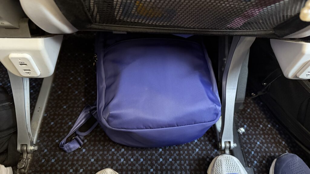 I have my inflight pouch. I put my crossbody bag beside my personal item under the seat or on top of it.