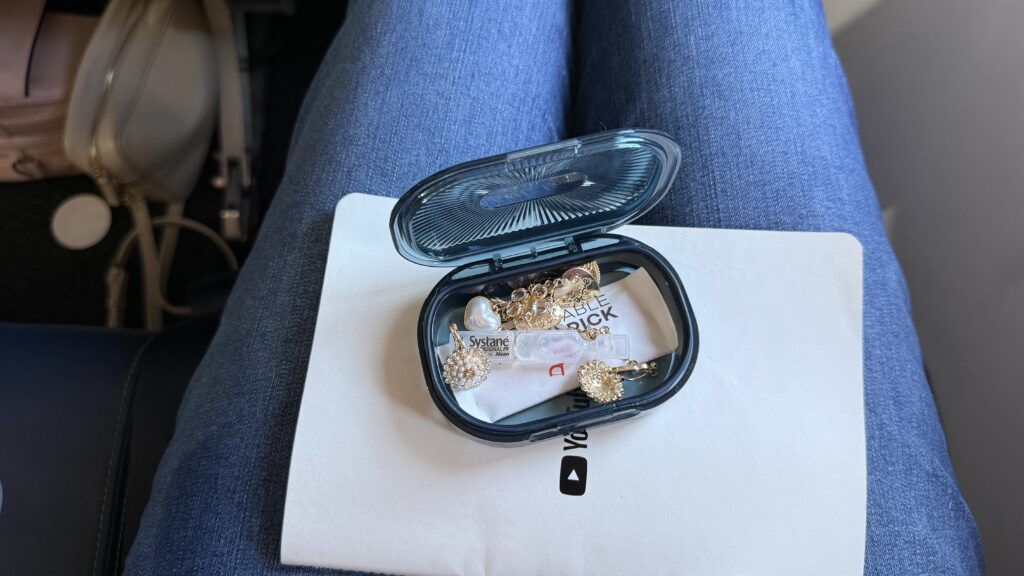 This is my newest case-it holds my jewelry for the end of the flight, and it also has an individually wrapped floss stick as well as my eye drop vial.
