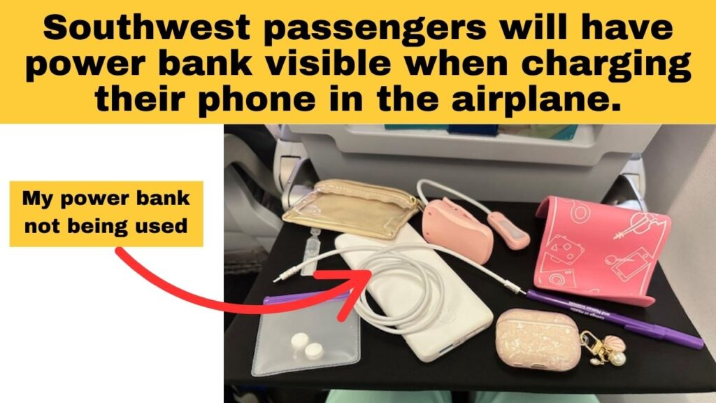 In the TSA line, all electronic cords stay in your carry-on bags unless the officers tell you to take out the electronic device that is larger than a phone. But the cords, the batteries stay in your bags until you get to the airplane. So if flying Southwest Airlines, just have your power bank in your personal item, and either
